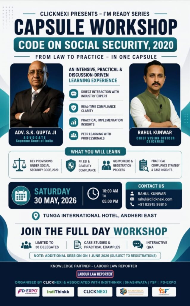 Code on Social Security 2020 | From Law to Practice – In One Capsule In today’s rapidly evolving compliance landscape, understanding the Code on Social Security, 2020 is no longer optional—it’s critical. Join us for an intensive, practical, and discussion-driven full-day workshop designed exclusively for HR leaders, compliance professionals, consultants, and business decision-makers. Click Here to Register or visit https://rzp.io/rzp/teP7qHk5 […]